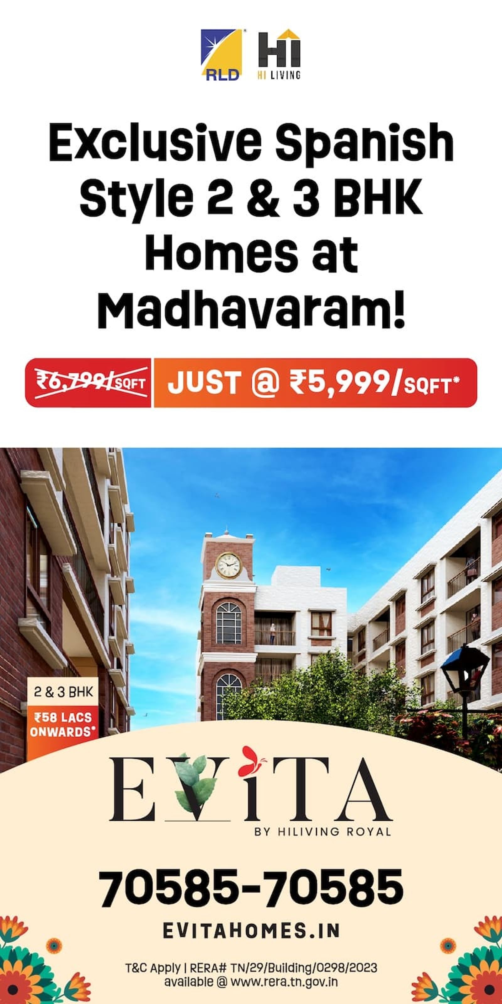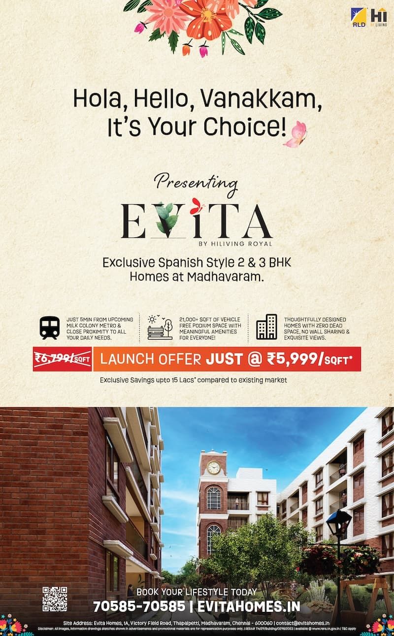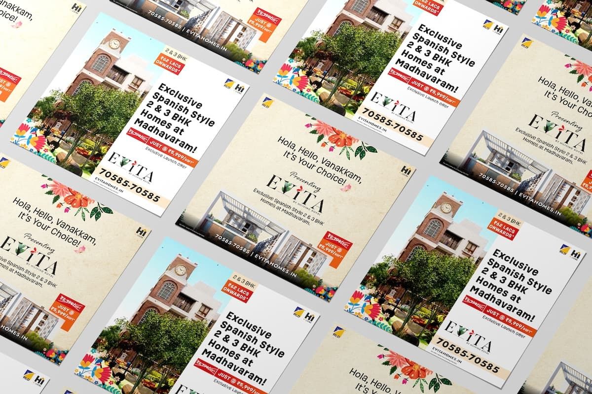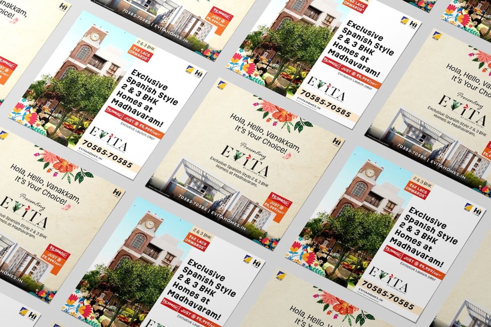 Evita Homes is an upcoming residential project located in Chennai, and it is a remarkable addition to TICCO’s diverse portfolio of creative projects. The project is an embodiment of the perfect blend of our client’s vision and our strategic and imaginative execution. With a Spanish-themed concept, the idea is to offer a luxurious and sophisticated living experience crafted from scratch. Our team was involved in the project's comprehensive development, from creating its unique identity to devising the detailed communication blueprint. We created engaging campaign concepts and captivating communication designs to ensure that Evita Homes stood out as a vibrant and one of the successful launches of recent times in Chennai. Experience our journey below: